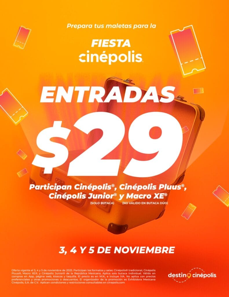 La segunda promoción es la “Fiesta Cinépolis”, que se llevará a cabo los días 3, 4 y 5 de noviembre, ofreciendo boletos a solo $29 pesos en todas las funciones y formatos: Cinépolis tradicional, Plus, Junior y Macro XE.