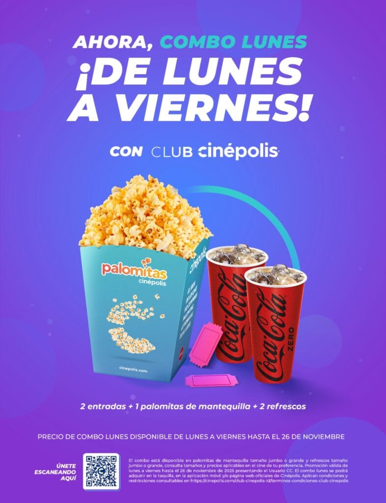 La primera es el Combo Lunes, ahora disponible de lunes a viernes, con un precio de $255 pesos que incluye dos entradas al cine, una palomita de mantequilla y dos refrescos. Una opción perfecta para parejas o amigos que buscan una salida divertida sin gastar de más.