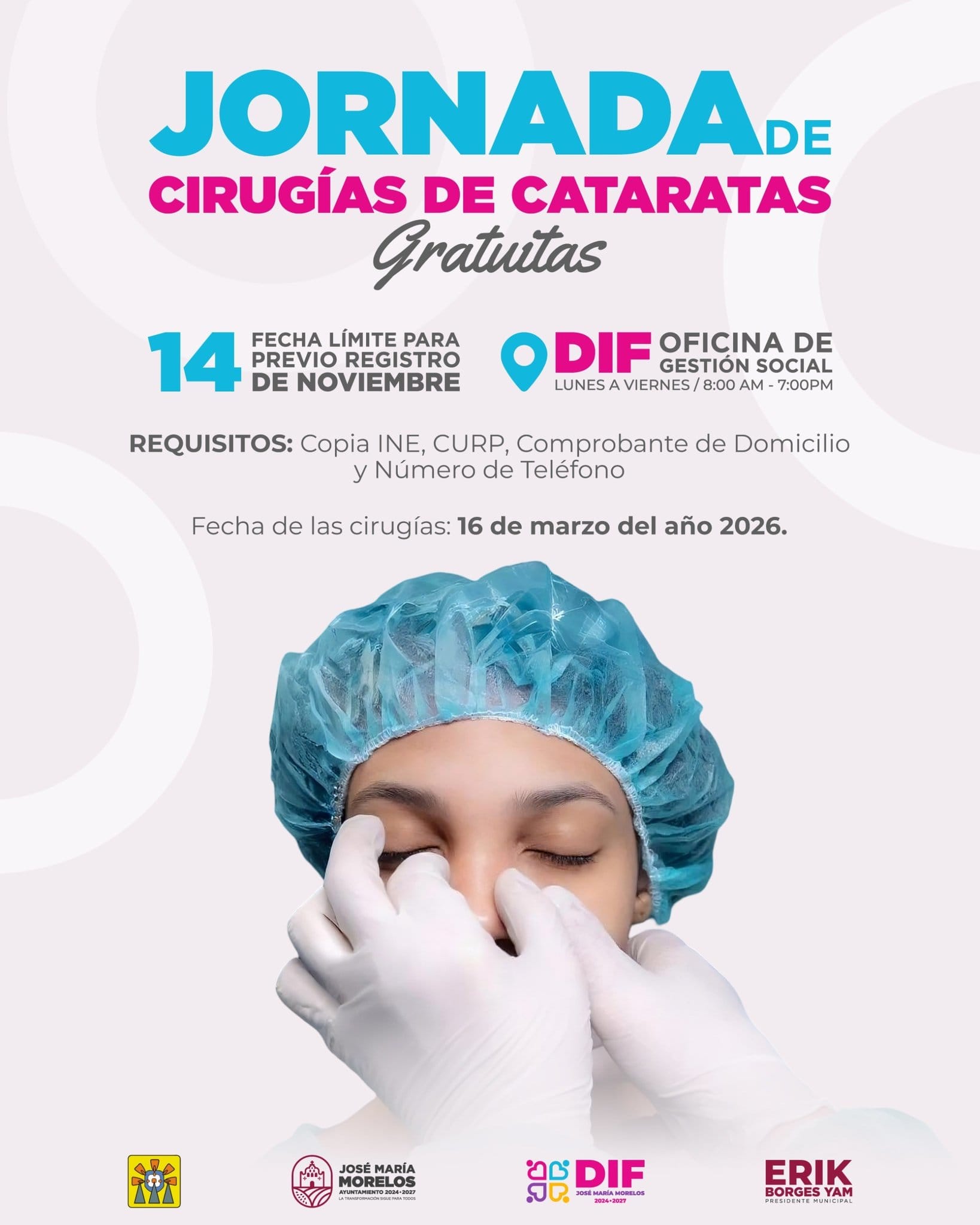 José María Morelos.– Para seguir impulsando acciones que mejoren la salud y el bienestar de las familias del municipio, el DIF Municipal, en coordinación con el Ayuntamiento que preside Erik Borges Yam, anunció la apertura de la convocatoria para la Cuarta Jornada Gratuita de Cirugías de Cataratas, dirigida a personas que necesitan recuperar su visión y elevar su calidad de vida mediante este procedimiento seguro y de alta efectividad.